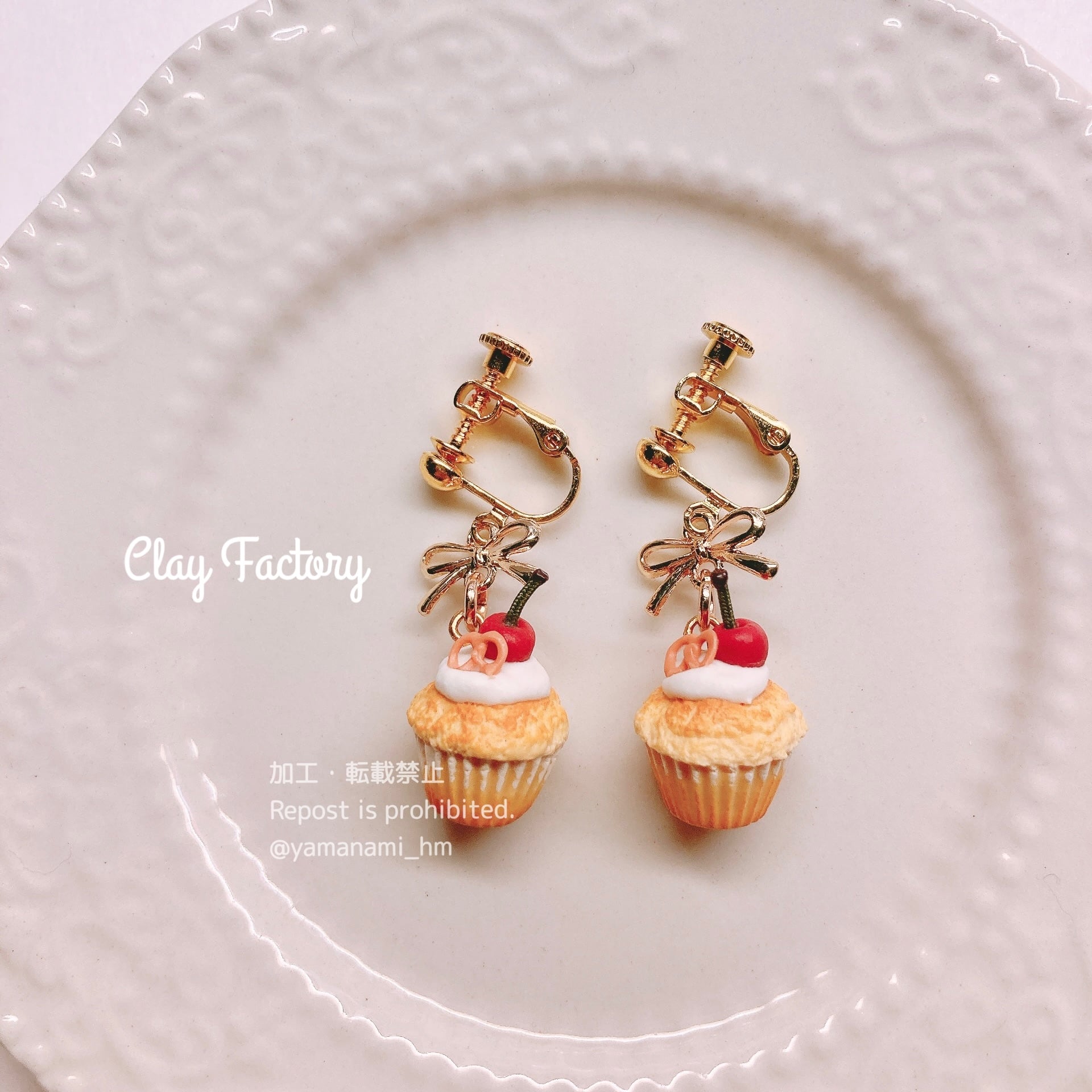 プレッツェルとチェーリーが乗った小さなカップケーキのピアス・イヤリング。