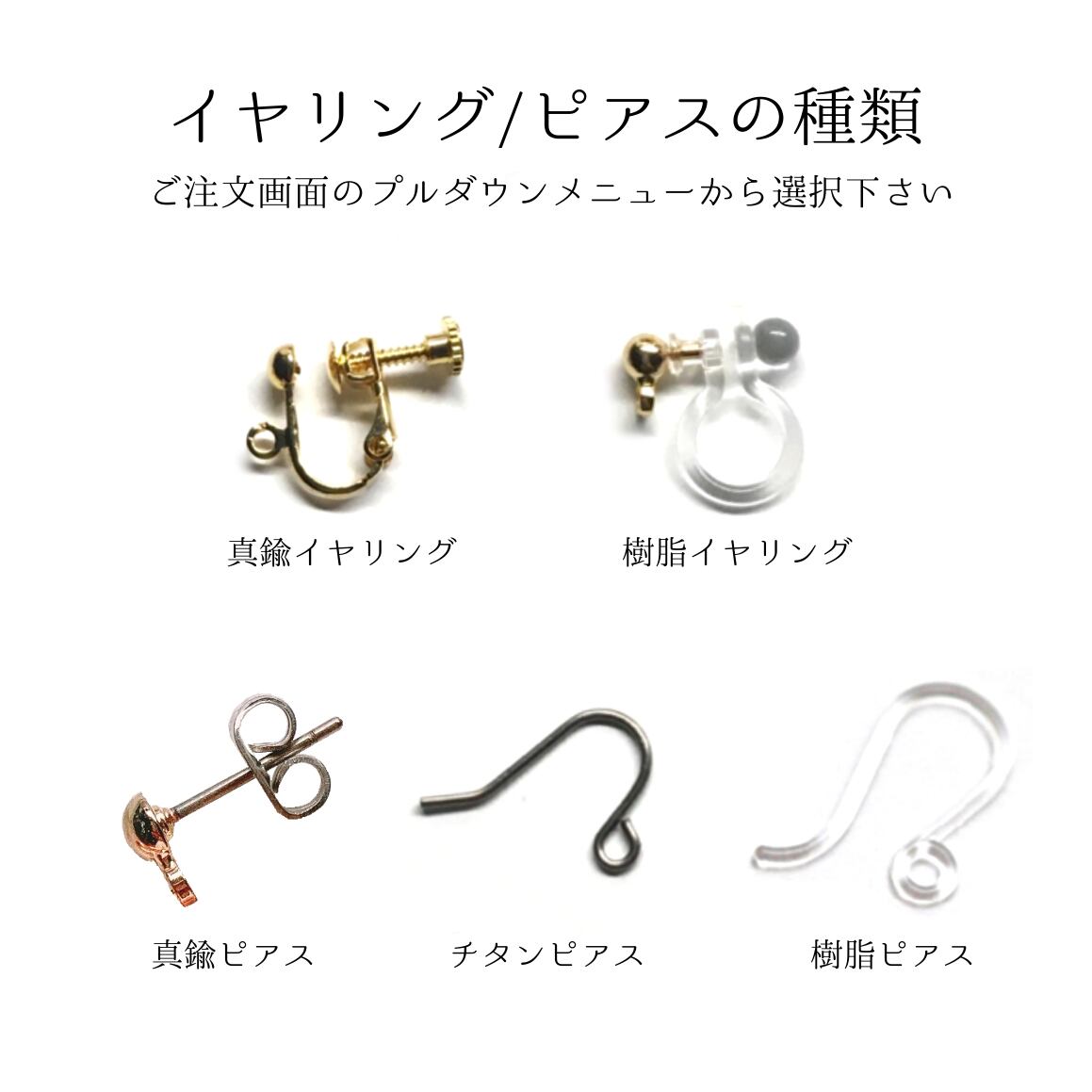 ピアス、イヤリングのパーツは樹脂、チタンもご用意しております。